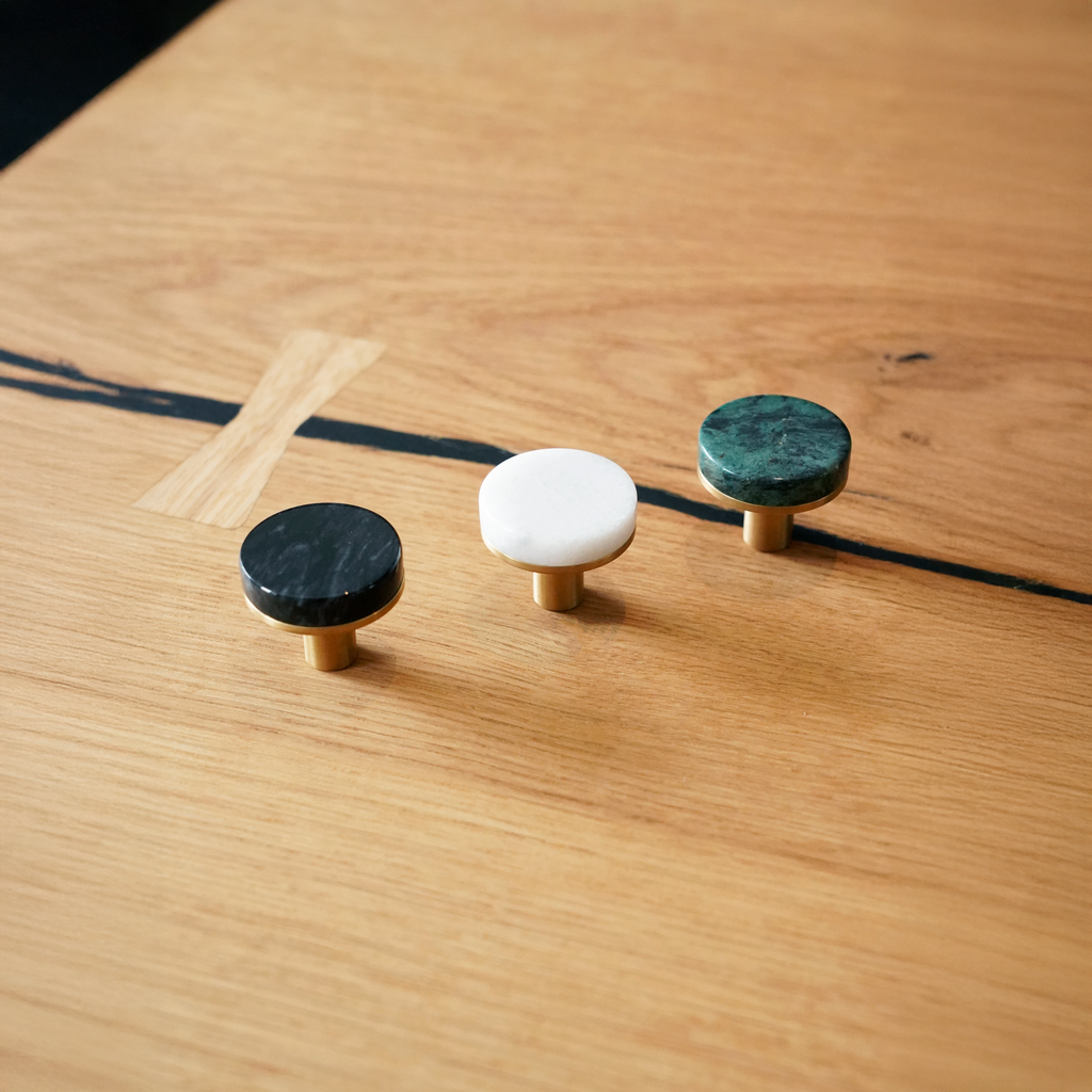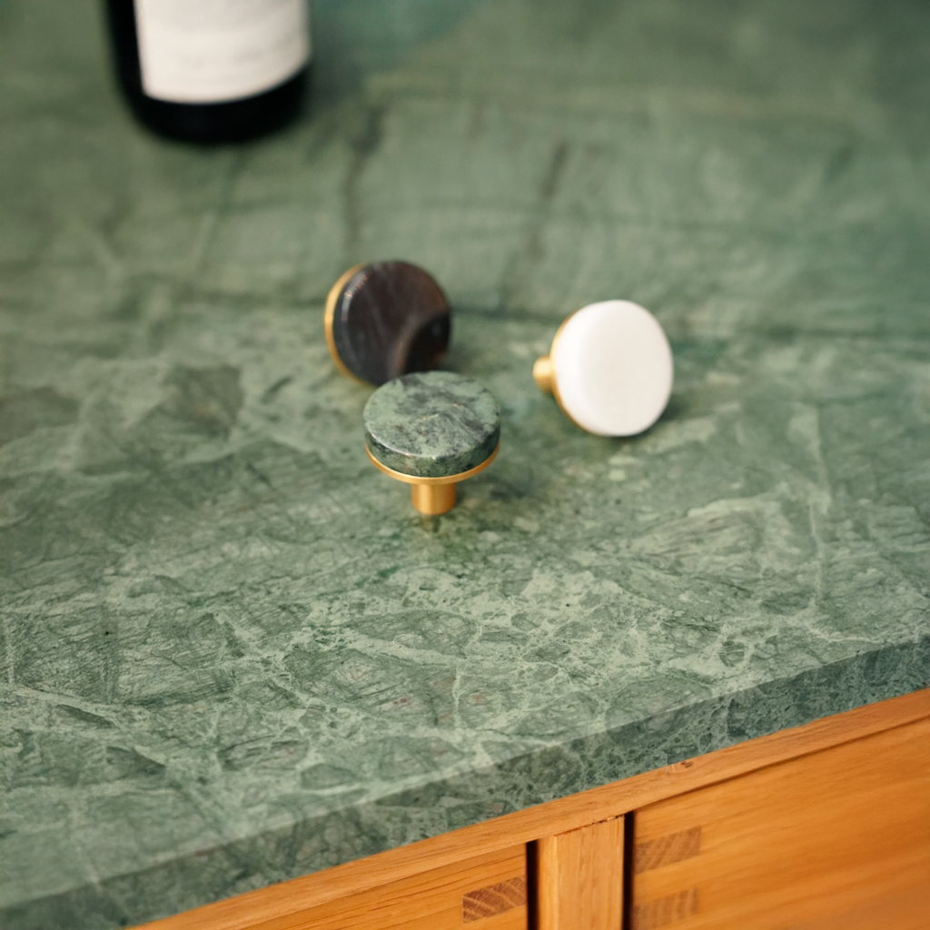 Knoppen er fremstillet i marmor og massiv børstet messing, som er et yderst stærkt materiale. Denne knop er med lak, som beskytter produktet mod patinering og sørger for, at det holder sin ensartede overflade i lang tid.