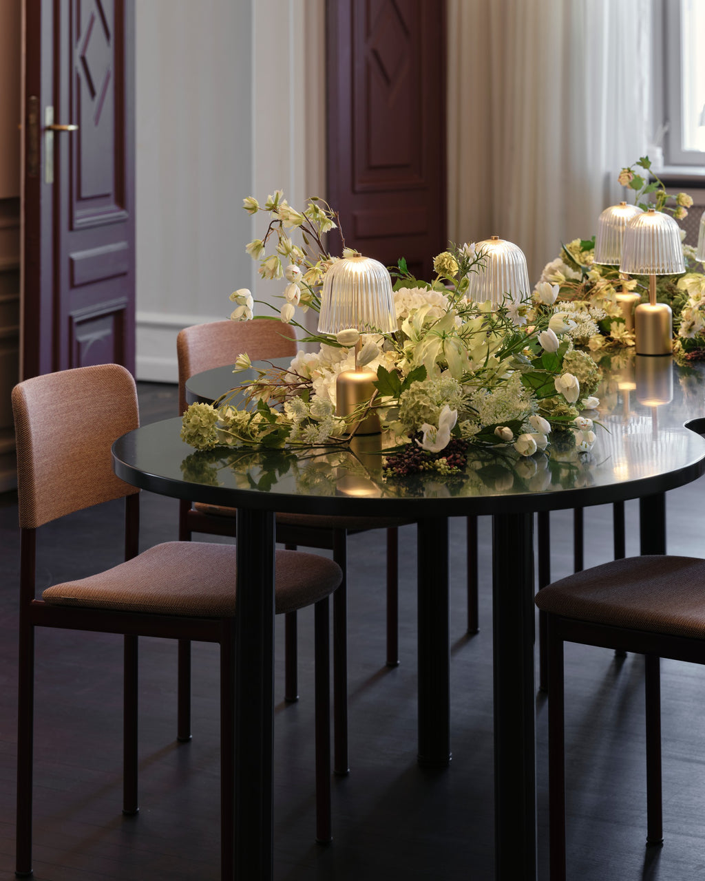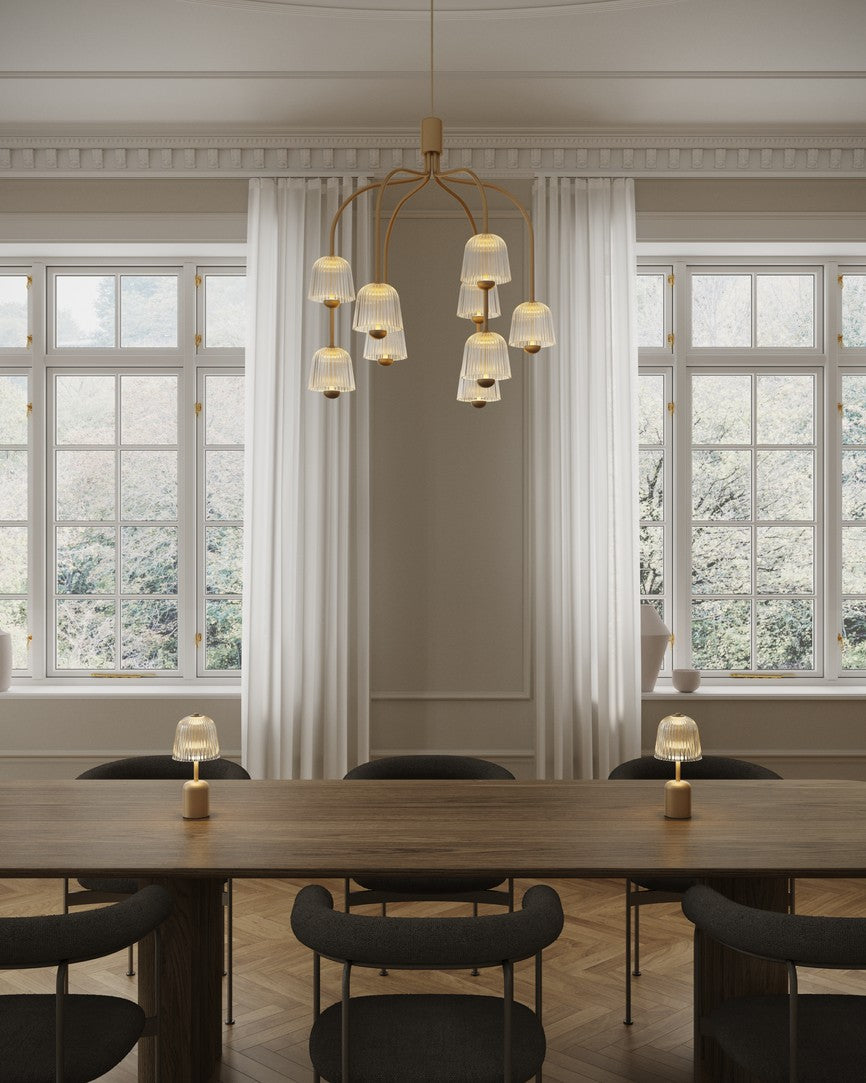 Asteea Portable fra NUURA er en elegant, trådløs lampe inspireret af klokkeblomstens bløde former. Den rillede, klokkeformede skærm i genanvendeligt akryl spreder et roligt og behageligt downlight, som oplyser fladen under lampen uden at blænde. Den gyldne base giver lampen et eksklusivt udtryk og skaber en varm refleksion, når lyset rammer overfladen - perfekt til både spisebordet, vindueskarmen eller terrassen på en lun sommeraften.