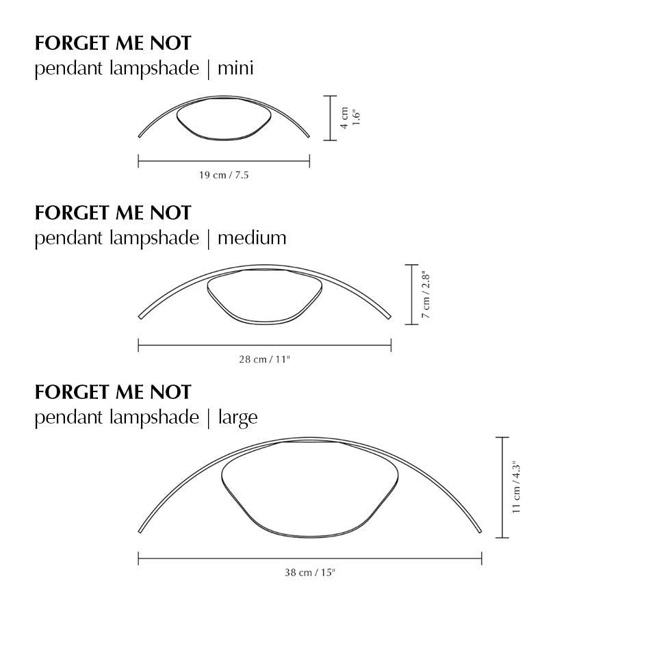 Pendlen leveres komplet med roset, ledning, fatning og lyskilde - klar til montering. Den fås i tre størrelser og tre farver, hvilket gør det muligt at kombinere flere lamper med Rosette Mini og skabe smukke, livlige klynger. Uanset om den hænger alene eller i grupper, tilfører Forget Me Not et blomstrende og ekstraordinært touch til enhver indretning.