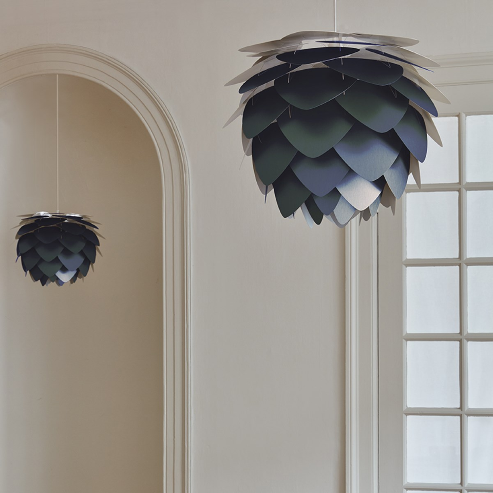 Aluvia lampeskærmen fra danske UMAGE kombinerer inspiration fra natur, byliv og skovens fortryllende omgivelser i ét eklektisk design. De karakteristiske blade af aluminium gør lampen både let og robust, samtidig med at den tilfører en organisk elegance til rummet.