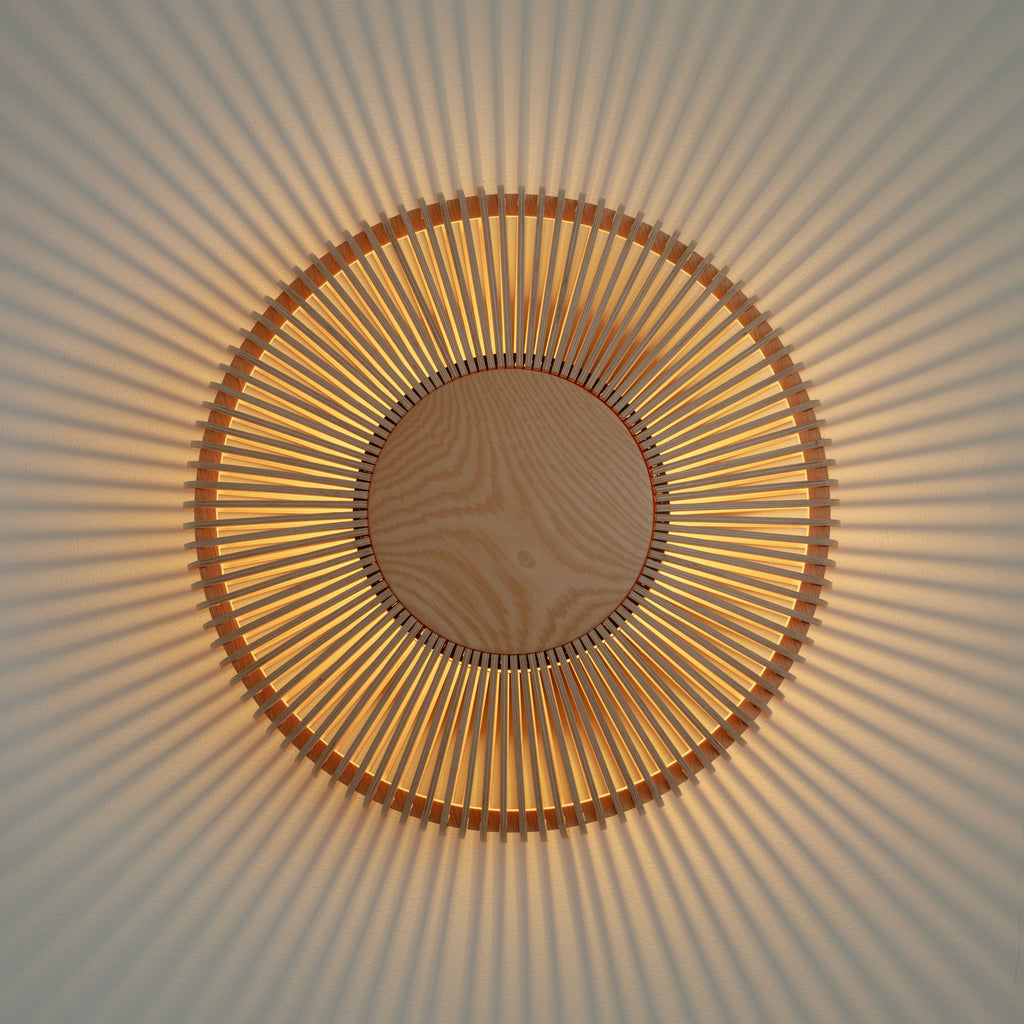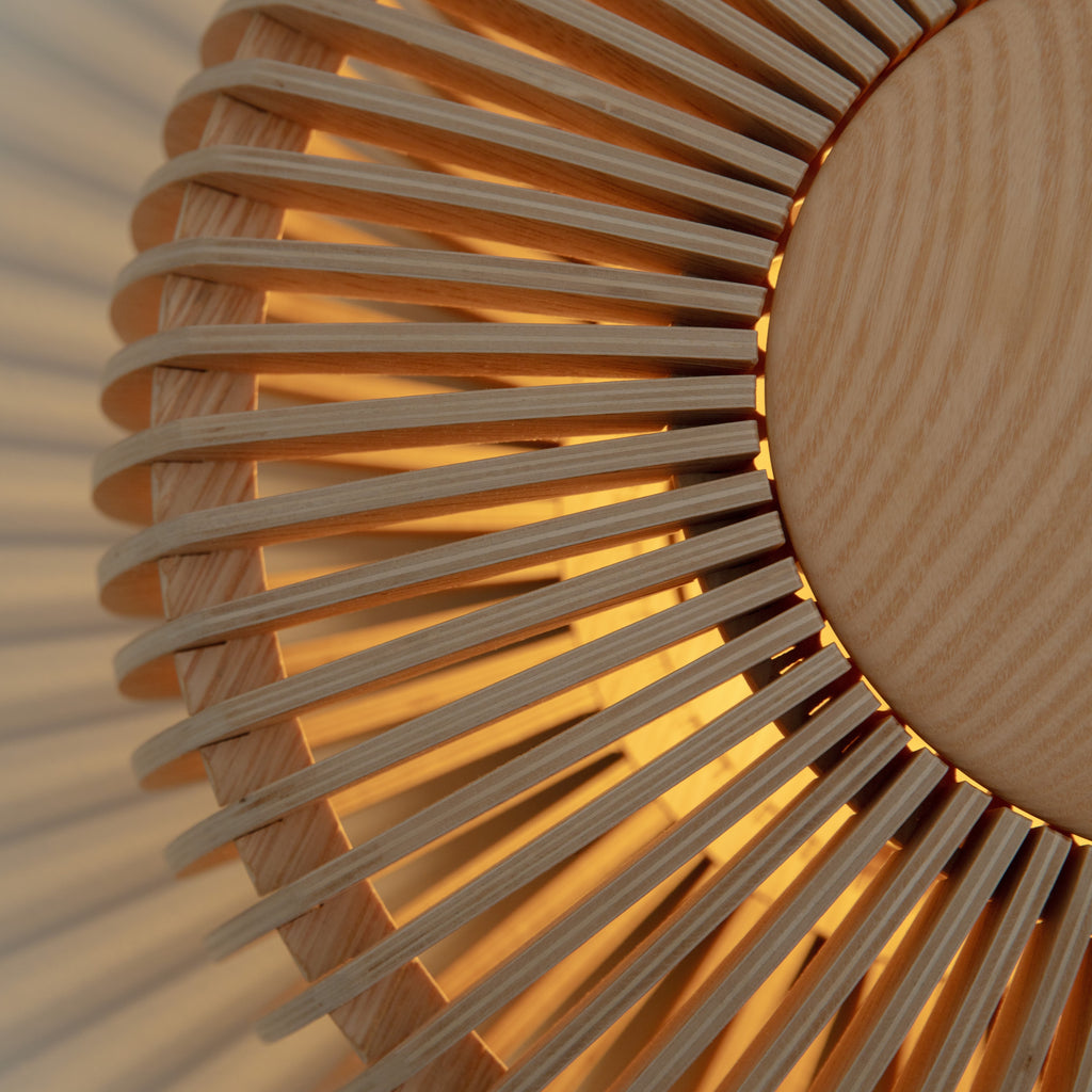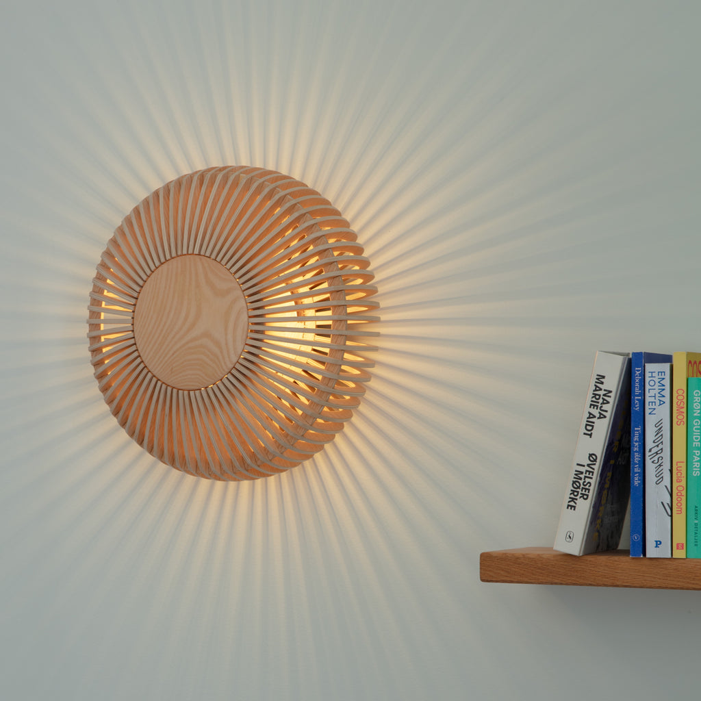 Clava Up Wood fra UMAGE er en væglampe fremstillet af laserskårede trælameller, der skaber et legende lysspil på væggene og tilfører varme og karakter til rummet.