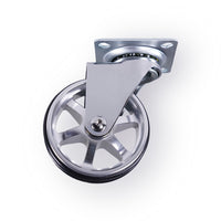 Eksklusivt møbelhjul i laserskåret i blank poleret aluminium med forkromet hus med bremse og firkantet monteringsplade. Stærkt hjul med dobbelte kuglelejer og dobbelte gummibaner på hjulet.