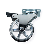 Eksklusivt møbelhjul i blank poleret laserskåret aluminium med forkromet hus og firkantet monteringsplade, uden bremse. Stærkt hjul med dobbelte kuglelejer og dobbelte gummibaner på hjulet.